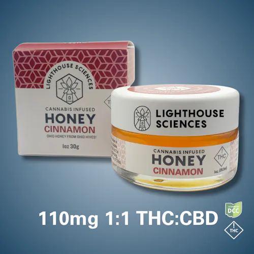 Lighthouse Sciences Hot Cinnamon Honey combines natural cinnamon flavor with a balanced 1:1 THC:CBD ratio. Crafted from raw Ohio honey, this infused honey is ideal for stirring into coffee, tea, or recipes. Each jar includes a convenient scoop for accurate dosing. .Whether stirred into warm beverages, drizzled over food, or used in recipes, this infused honey delivers consistent cannabinoid content in every serving. Lighthouse Sciences sources its honey from Ohio beekeeper and apiarist Dr. David Heilman, whose team gathers the state’s finest wildflower honey. That all-natural product of the bee’s hard work blends with Lighthouse Sciences’ innovative extraction process, resulting in edible cannabis that accentuates the taste of honey rather than overpowering it Serving Size ½ tsp (included scoop) = 12.5mg THC + 12.5mg CBD Total jar: 110mg THC + 110mg CBD (approximately 8–9 servings) Ingredients Raw Ohio honey, cannabis oil (butane extracted), CBD isolate (CO₂ extracted), propylene glycol, natural flavorsL